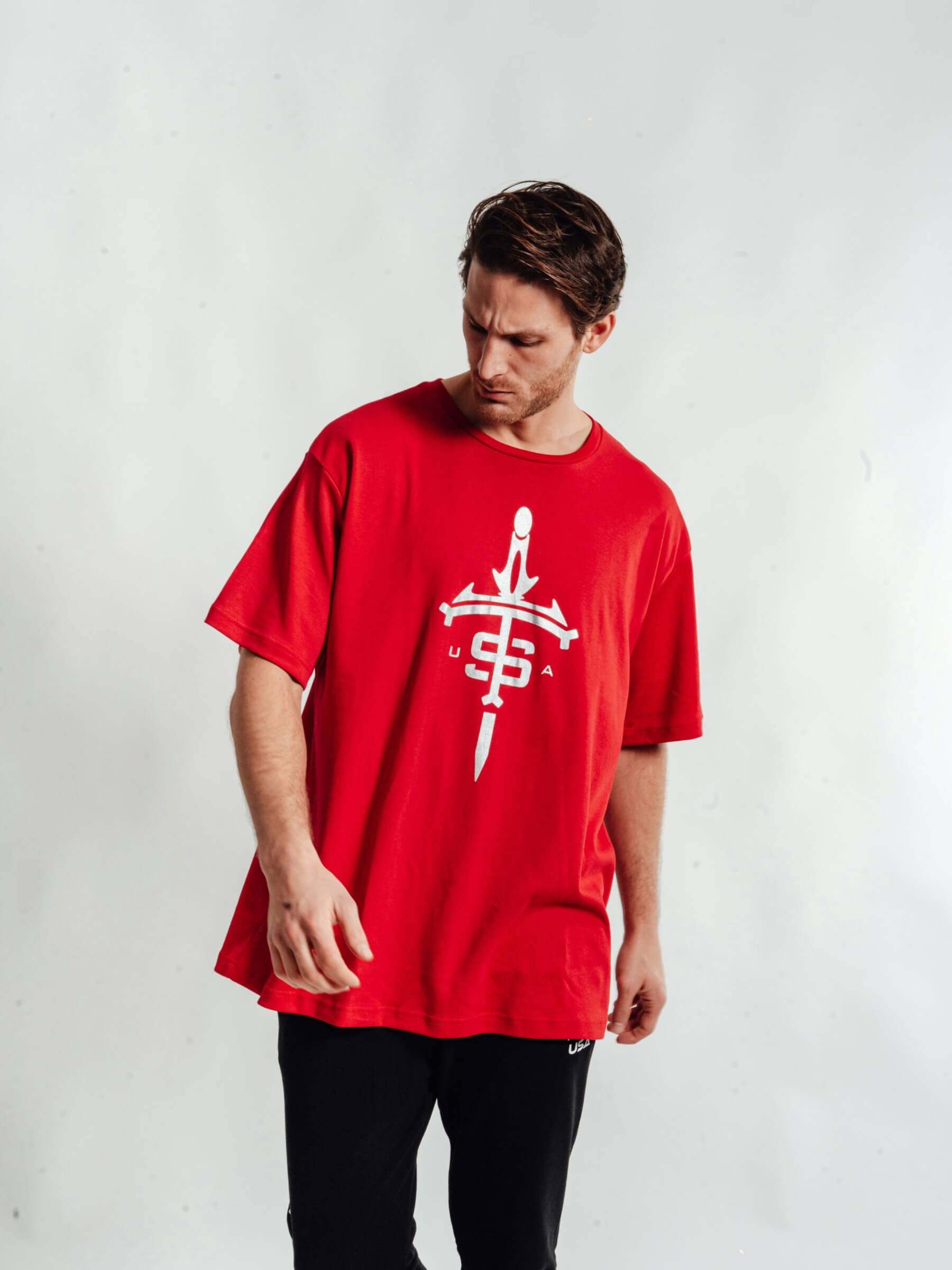 Contrast-trim crew neck. Embossed symbol on the chest. Short sleeve. Straight hem.