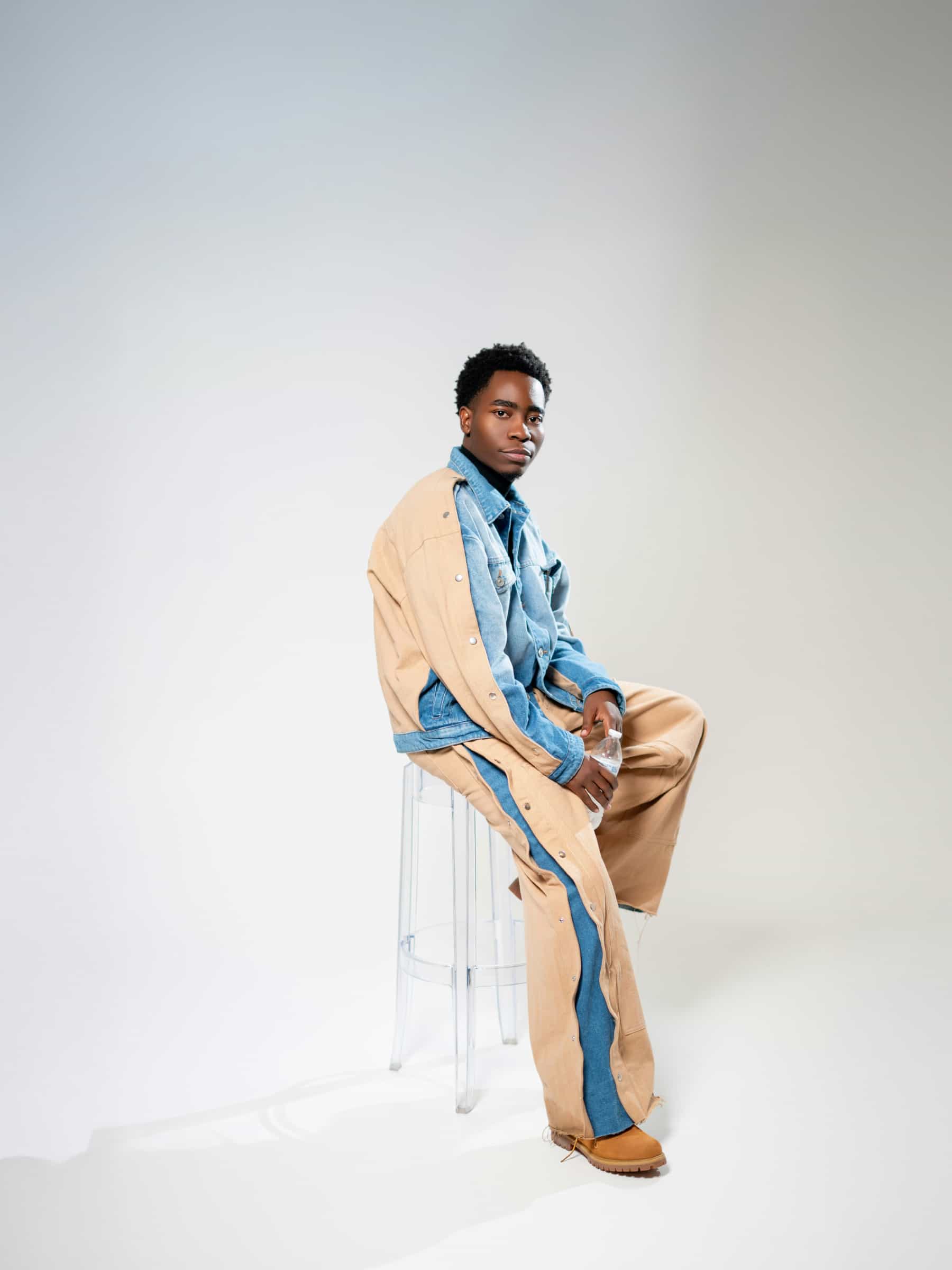 Wide denim pants with rivets on the side.